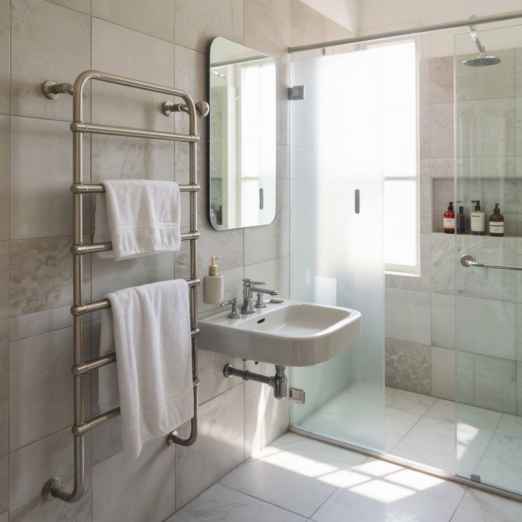 Montering av handdukstork i badrum. Lidingö, Skärsätra